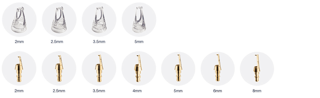 7 spot sizes for customized treatments, 4 of which are available also as disposable tips: